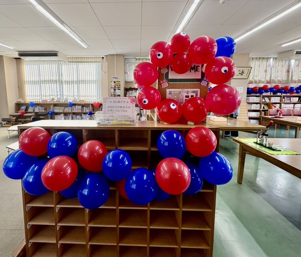 赤と青の鮮やかなバルーンが書棚を縁取り、いつもは落ち着いた図書室が、まるで万博会場のようなエネルギッシュな空間に生まれ変わりました。