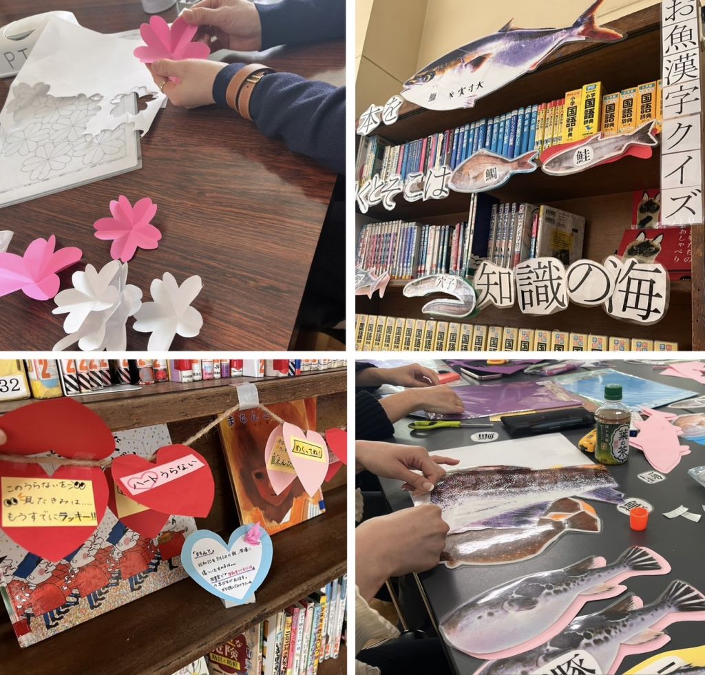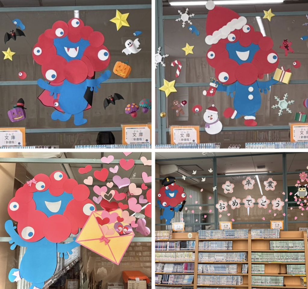 季節ごとの装飾で図書室を明るく彩ってくださいました。特に「ミャクミャク」をモチーフにした装飾は、子どもたちや先生方にも大変好評でした。