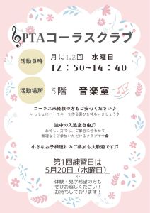 ※なお、体験・見学希望、ご質問などがある方は、学校ホームページ「PTA委員会、クラブの募集について」のコーラス欄よりGoogleフォームにて受け付けもしております。