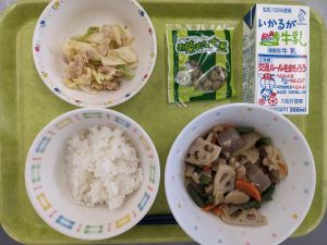 ごはん 筑前煮 ツナとキャベツのごまいため まっ茶大豆 牛乳