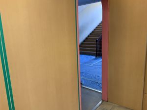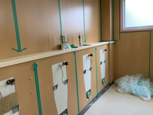 今回の休校期間には、1階トイレの改修工事が進んでいます。壁紙をはがして、タフパネルに変え、天井も床も、「消臭」「防かび」のものに張り替えます。また、新しく大きめの換気扇も設置されます。