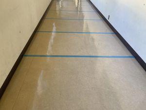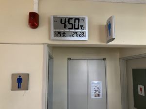しばらくの間は、廊下の本も読むことができないため、布でおおったり、また、人との距離の取り方の感覚を身につけさせるために、廊下に、1mごとにテープを貼ったり、熱中症対策として、トイレの前には、温度・湿度も測れる時計を設置したりしました。