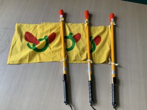 本校では、保護者の皆様には、子どもたちが安全に登校できるよう、みまもり当番にご協力いただいています。今回、これまで使っていた旗の持ち手を「ホイッスル機能」の付いたものに変更しました。