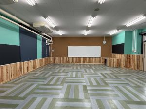 昔の附天小をオマージュして、壁に板材を貼り、床も寄木模様にしてみました。壁の色も他の教室とは全く異なる「グリーンブルー」で、華やかになりました。