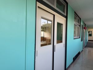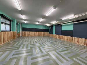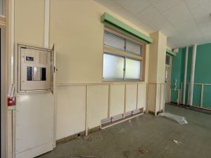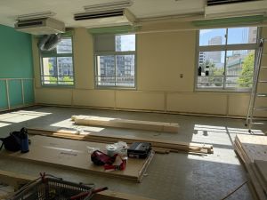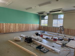 昔の附天小をオマージュして、壁に板材を貼り、床も寄木模様にしてみました。壁の色も他の教室とは全く異なる「グリーンブルー」で、華やかになりました。