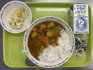 ごはん 牛乳 チキンカレーライス キャベツとコーンのサラダ ミニフィッシュ