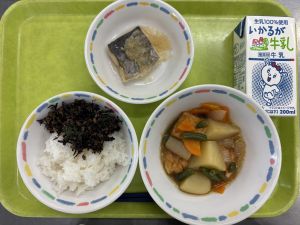 ごはん 牛乳 さごしのおろしじょうゆかけ 含め煮 牛ひじきそぼろ