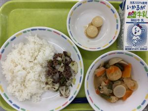今日は、月見の行事献立がでました。月見の日には、「いも」や「だんご」を食べます。