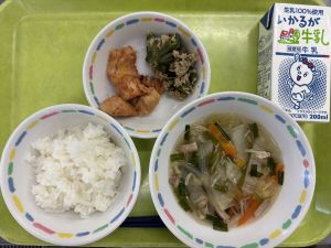 10月29日(水)の給食 2025.10.29 今日の給食 ごはん 牛乳 鶏肉のチリソース焼き 焼き豚のスープ ツナとさんどまめのいためもの 今日の給食は、鶏肉のチリソース焼きがでました。 チリソース焼きのチリは、トウガラシが入っておりピリ辛な味付けでした。 « 前へ一覧へ 次へ » 関連する学校生活 11月14日(金)の給食 2025.11.14 今日の給食 11月12日(水)の給食 2025.11.12 今日の給食 11月11日(火)の給食 2025.11.11 今日の給食 11月10日(月)の給食 2025.11.10 今日の給食 学校生活 学校行事 トピック 安心・安全のために 今日の給食