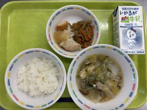 11月10日(月)の給食 2025.11.10 今日の給食 ごはん 牛乳 鶏肉のおろしじょうゆかけ うすくず汁 きんぴらごぼう 今日の給食では、うすくず汁がでました。 うすくず汁とは、水溶きの葛を仕上げに加え、少しとろみを付けた汁です。 給食では、じゃがいもでん粉でとろみをつけました。 « 前へ一覧へ 次へ » 関連する学校生活 11月14日(金)の給食 2025.11.14 今日の給食 11月12日(水)の給食 2025.11.12 今日の給食 11月11日(火)の給食 2025.11.11 今日の給食 11月10日(月)の給食 2025.11.10 今日の給食 学校生活 学校行事 トピック 安心・安全のために 今日の給食