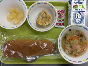 米粉パン 牛乳 ツナポテトオムレツ ケチャップ スープ 洋なし(カット缶)