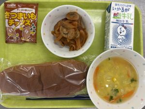 4月20日(月)の給食 2026.04.20 今日の給食 黒糖パン 牛乳 コーンスープ 煮込みハンバーグ おさつチップス 今日は1年生の給食開始日でした。 初めての給食を、みんな一生懸命に食べてくれていました。 « 前へ一覧へ 次へ » 関連する学校生活 4月21日(火)の給食 2026.04.21 今日の給食 4月20日(月)の給食 2026.04.20 今日の給食 4月17日(金)の給食 2026.04.20 今日の給食 4月16日(木)の給食 2026.04.20 今日の給食 学校生活 学校行事 トピック 安心・安全のために 今日の給食
